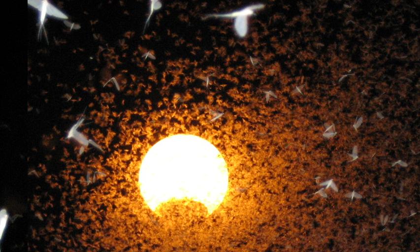 上の写真は、カゲロウがオレンジ色の電燈に群がっているので、オレンジの雲がかかっているように見えます。画面手前の白いものが、カゲロウです。(ちなみにカゲロウと言っても何百種もあり、写真のカゲロウの正式名を探してみましたが見つかりません。モンカゲロウに似ているのですが、これではないみたいです)