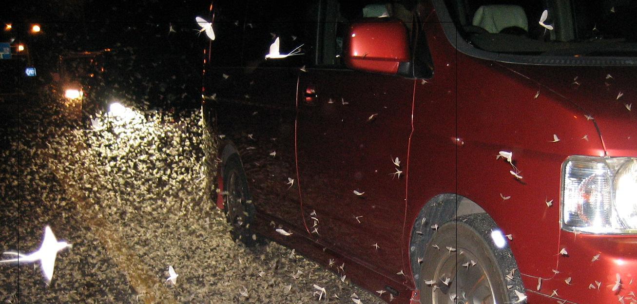 車のライトに照らし出されたカゲロウは、雪ではないことは一目でわかるのですが‥(下の写真)。カゲロウの死骸がそこここに無数にあり、タイヤで踏むとスリップする恐れがあるくらいです。
