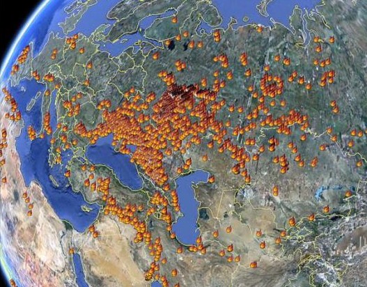 上の画面は、ロシアの山火事の発生件数を示しています。その範囲は広大で、これほどまでだとは…。(画像も、クリックすれば拡大されます)