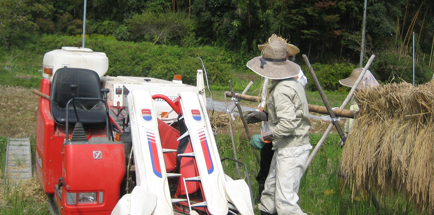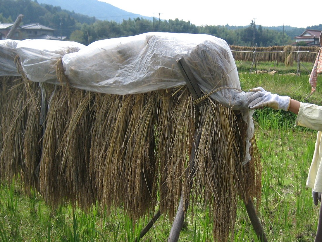 写真は、雨よけシートをつけた稲です。よく乾燥していないと脱穀できないため。