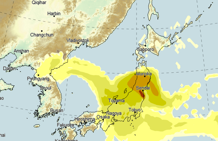 日本国内の福島原発を中心にした雲の広がりがわかり、放射性物質の拡散予報を出しているところです。