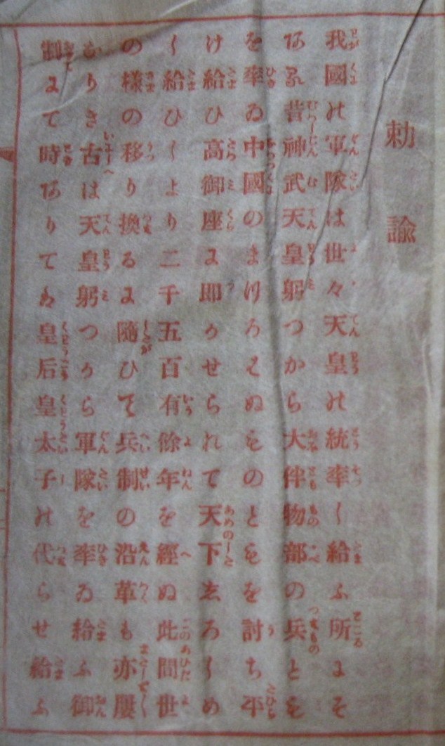 つまり、明治・大正・昭和の3代の天皇がそれぞれに勅諭を出しています。しかも、この3つの勅諭は赤字で印刷されています。赤紙ってわけです。これ以外はみな黒字で印刷されています。